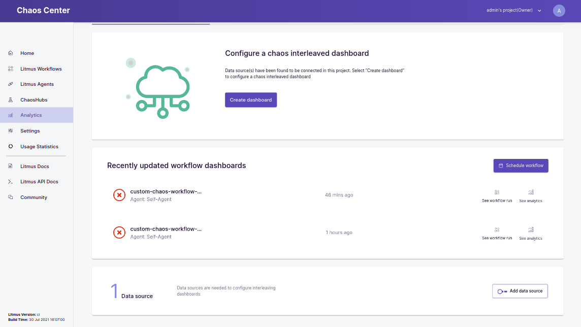 Overview Tab helps you to manage your connected data sources and dashboards, all while making it easier to view and analyze your chaos scenarios. The overview tab is split into 3 parts -