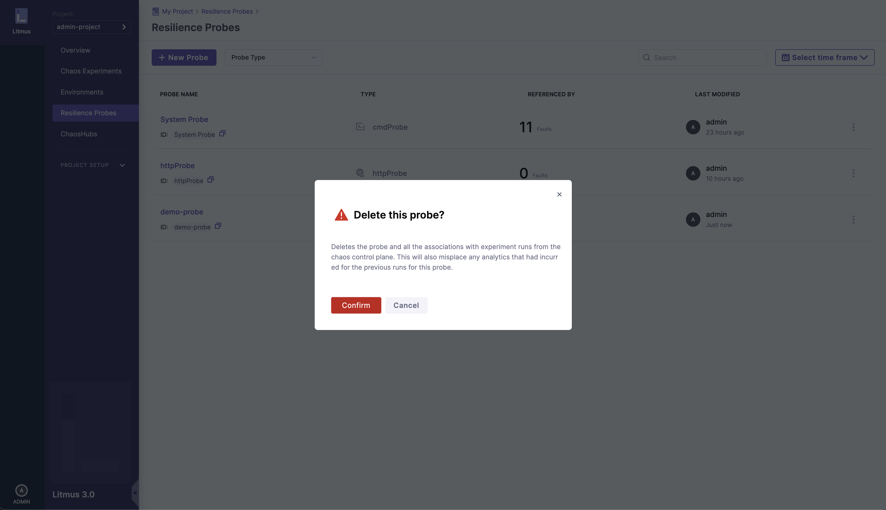 After opening the options menu and clicking on the Delete Probe option, you'll see a prompt in order to confirm your action. Please ensure that you want to delete the selected Resilience Probe and select the Confirm button: