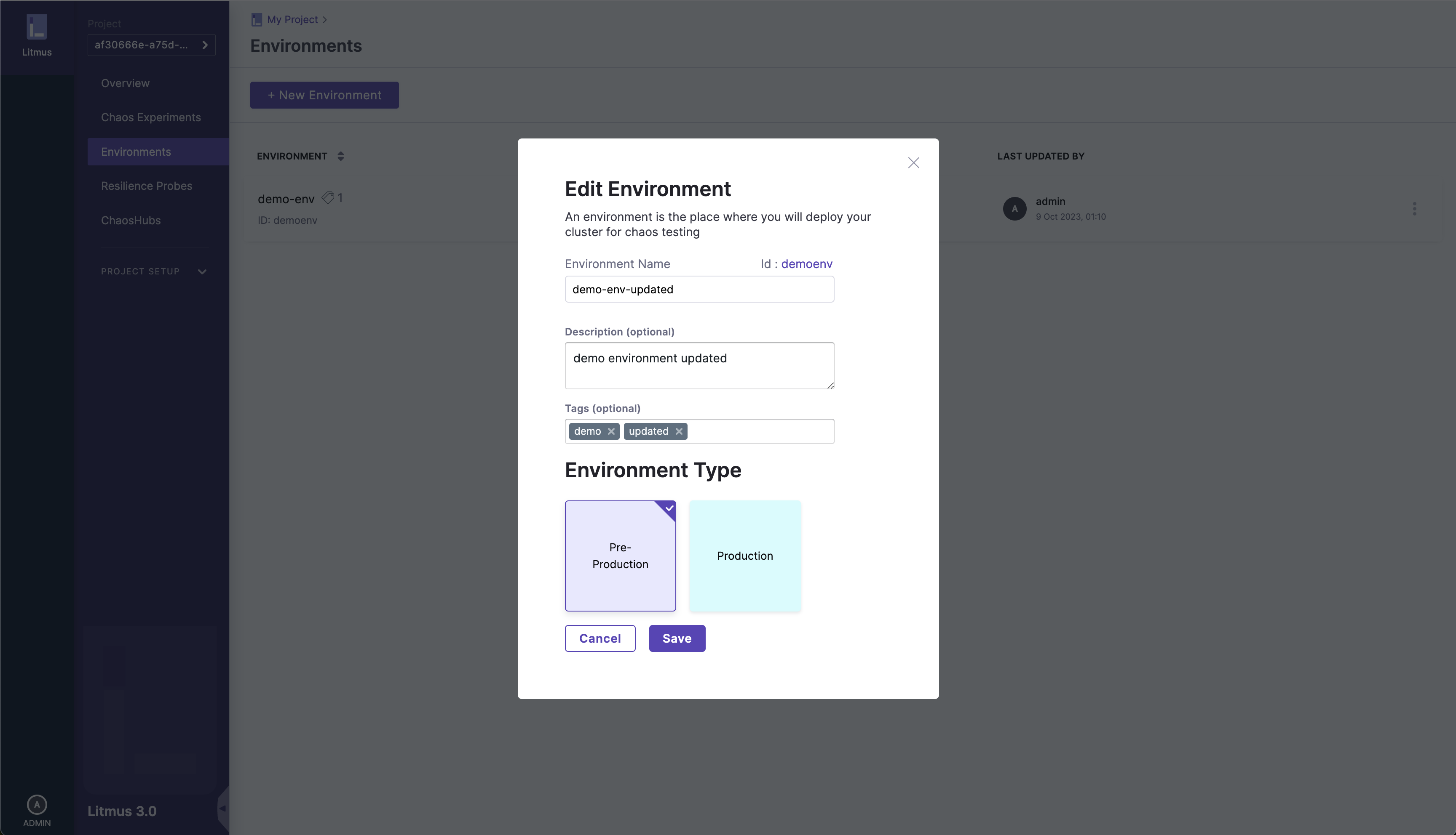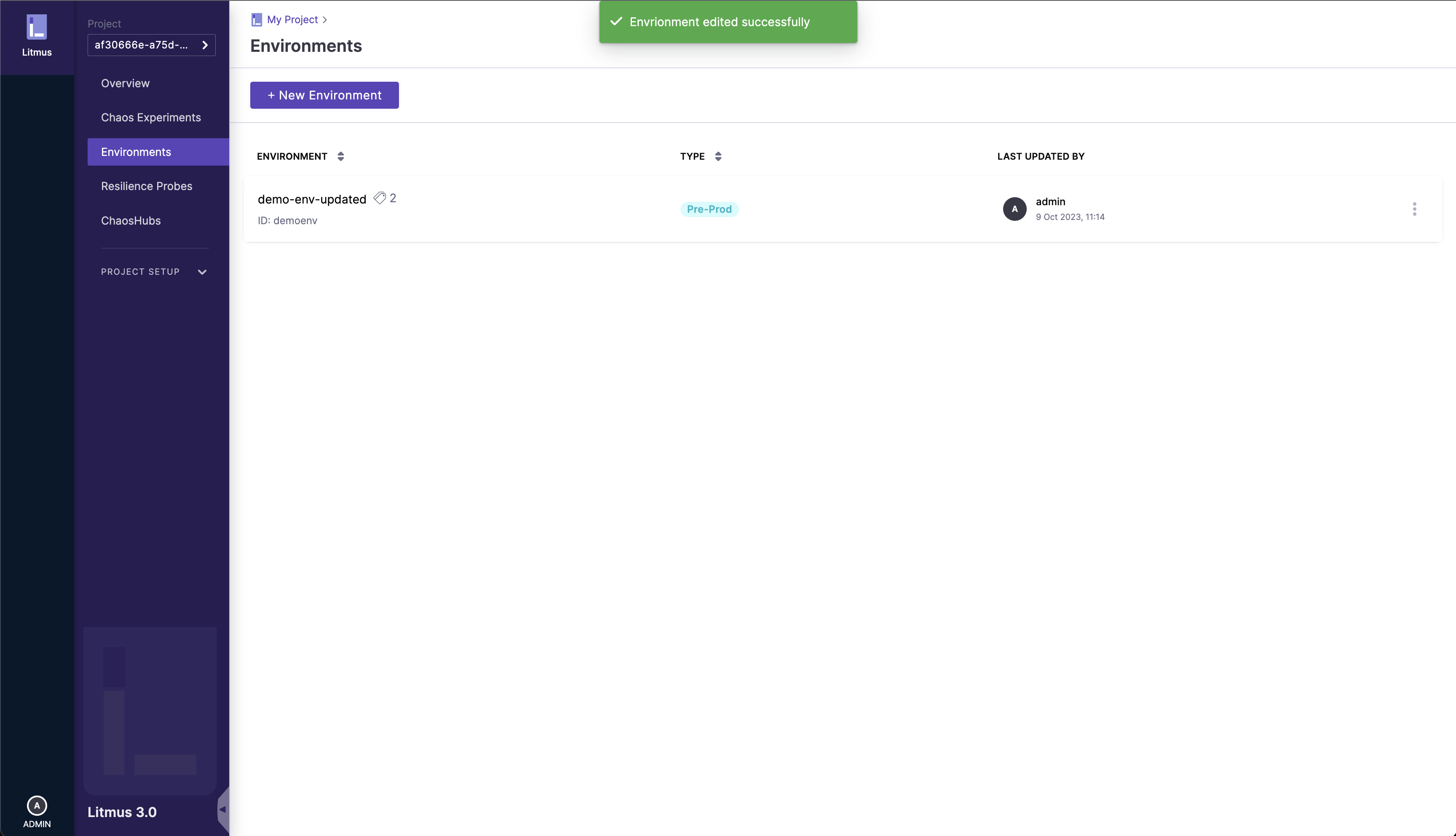 Navigate to the /environments page (Environments sidebar option on the left nav), click on the â‹® icon to open the options menu and select Edit Environment option: